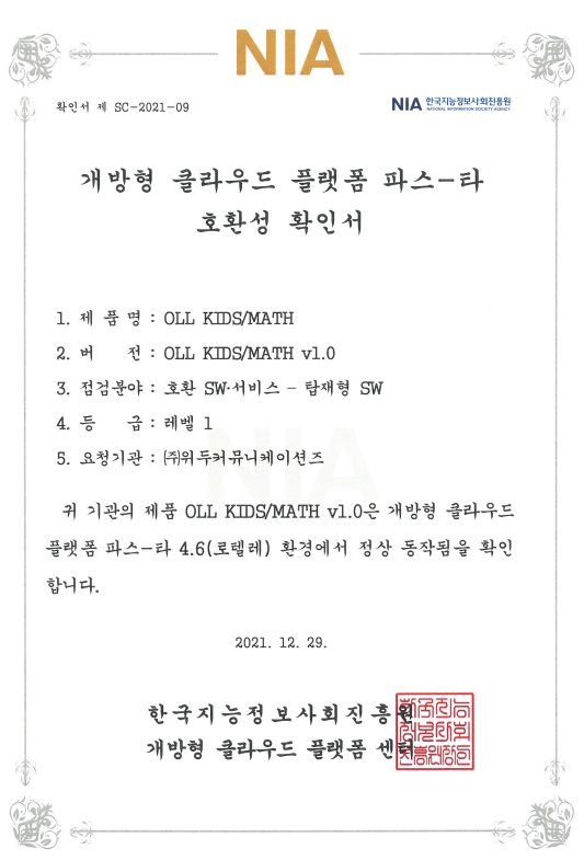 [한국/확인서] OLL KIDS/MATH 파스-타 호환성 확인서 페이지 정보 작성자 WeDu 댓글 0건 조회 9,354회 작성일 21-12-31 12:48 본문 2021-12-29 확인서 제 SC-2021-09 점검분야 : 호환 SW서비스 - 탑재형 SW List Next[한국/인증서] OLL KIDS/MATH 클라우드 서비스 확인서 21.12.31